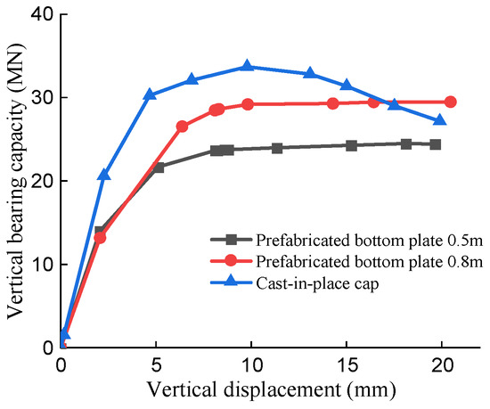 Under the abovementioned conditions, the vertical ultimate bearing capacity was not much different when the bottom plate thickness was 0.5 m and 0.8 m, respectively. This is related to the failure form of the bridge pier mentioned above. Therefore, based on the abovementioned full-scale model, a cap-only loading model was added to carry out by vertical displacement loading. When the thickness of the bottom plate increased, the vertical bearing capacity of the precast cap also increased accordingly. When the thickness of the base plate increased from 0.5 m to 0.8 m, there was a 20% increase in the vertical bearing capacity.
