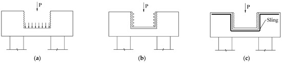 Components of vertical bearing capacity. (a) Bottom plate bending; (b) side wall shear key; (c) hanging bar suspension.