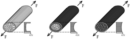 In the beginning of the research on TRC, textiles without impregnation were used [16]. Later on, the vast possibilities available with impregnation became clear. However, to fully utilize the tensile strength of the fiber material, all fibers in the roving would have to be loaded absolutely evenly. This case is theoretical. In case of an unimpregnated fiber strand embedded in concrete, only the outset fibers that are in direct contact with the concrete are loaded fully. The forces are transferred to the inner fibers only via friction. This friction is low, and consequently the inner fibers are nearly unloaded. Figure 1 shows the stress distribution in the cross-section of the fiber strands embedded in concrete with different degrees of impregnation. With increasing impregnation, the stresses become more even due to the improvement of the so-called inner bond between the single fibers. In a fully impregnated fiber strand (Figure 1 right), the stresses are nearly constant over the whole cross-section.