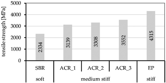 In Figure 13, only 48 k carbon fiber strands were examined, and they show the same trend between the Shore hardness and the tensile strength. Consequently, the Shore hardness of the impregnation material must have a significant influence on the tensile strength, although categorizing the textiles according to Shore hardness remains difficult as the transitions are fluid. This is because all of the impregnation materials have a certain range of hardness. Generally, EP is considered hard and SBR is considered mostly soft. ACR has a much wider range of hardness, which can also be seen in Figure 13.