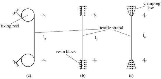 This method is not an option for textiles with a stiff impregnation because the small radius of the reel will lead to breaks in the impregnation of the strand. For stiff impregnated textiles, the testing regulated under EN ISO 10618 [27] is applicable, where two different types of clamping are described. Either both ends of the textile strand are embedded in resin to create two blocks to introduce the force (Figure 5b) or the yarn is clamped directly at both ends (Figure 5c). The first method is rather disadvantageous because it is very time-consuming, although the method with direct clamping can also be problematic because the clamping jaws made of metal are much harder than the impregnation of the fiber strand. This can damage the fibers and ultimately lead to tension peaks and the failure of the yarn at the clamp. One solution is to lengthen the clamping jaw to achieve the smooth transmission of force into the fiber strand (compare [28,29,30]).
