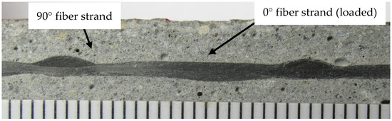 At the junction point of the 0° (loaded) and the 90° strands (see Figure 6), both strands are compressed, and the fiber strand’s cross-section is reduced compared with the one in the middle between the junction points. If the 0° fiber strand is pulled out of the concrete, the wider cross-section has to pass the smaller channel in the concrete. Thus, the fiber strand has to be compressed. The resistance against this compression influences the bond performance and depends on the transversal stiffness of the fiber strand [34].