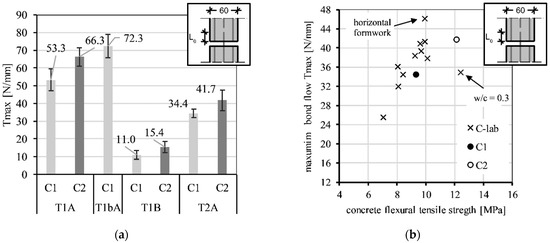 Influence of the yarn and concrete characteristics on the maximum bond flow tested in a single-sided pullout test: (a) textile geometries T1, T1b and T2; impregnation agents: A = acrylate, B = SBR; concretes C1 (fc,m = 100 MPa) and C2 (fc,m = 130 MPa); (b) tests performed with T2A and various concretes, adapted from [35,36].