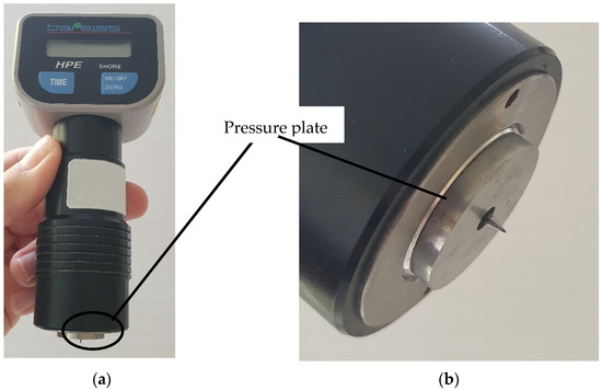 Shore D durometer according to [43], (a) shore D durometer, (b) detail of the pressure plate.