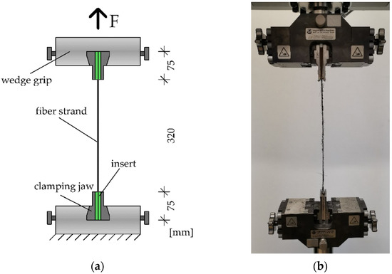 The tensile strength was tested following fiber strand test type c (Figure 5). Figure 11 shows the test setup. To perform the tensile tests, a universal testing machine Inspekt 100 from Hegewald und Peschke (Germany) was used.