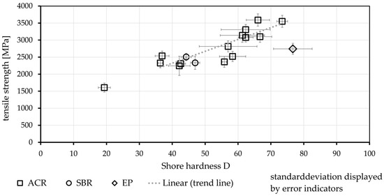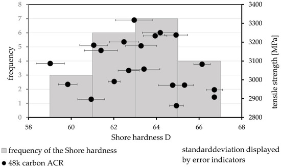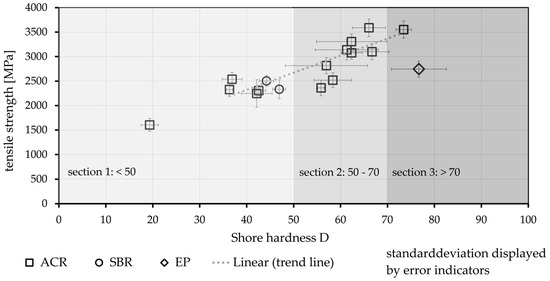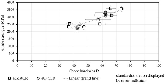 Correlation between Shore hardness and tensile strength of 48 k carbon textiles with varying impregnation agents (means values of 10–20).