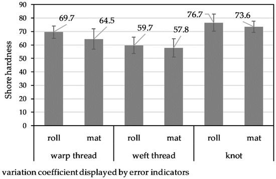 Figure 15 shows the Shore hardness of the warp thread, the weft thread and the knot of the same textile. Both the warp thread and the weft thread have the same 24 k roving, which are also both knitted. It is obvious that the knots exhibit greater hardness than both yarns. One reason for this could be that the knots are compressed during the production process, which in turn leads to greater stiffness in this area.