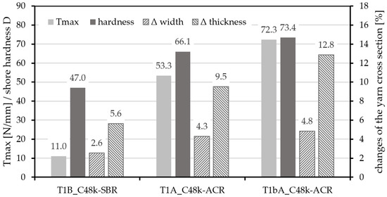Results (means) of the measurements of bond strength Tmax (6 single values) adapted from Reference [36], Shore hardness D (10 single values) and the changes in the yarn cross-section Δ width and Δ thickness (36 single values).