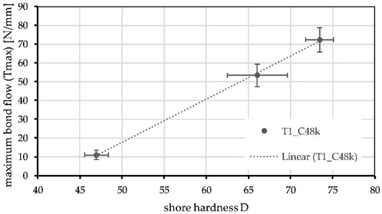The diagram shows that the impregnation material has a huge impact on the bond performance (Tmax). While the SBR impregnation led to a Tmax of 11.0 N/mm, the maximum bond flow of the ACR-impregnated fiber strand was more than six times higher. The measured hardness ranged from 47 to 73. This means that the ACR was stiffer than the SBR by a factor of 1.55. Additionally, the changes in the yarn cross-section differed. Both ACR-impregnated textiles showed greater deltas. This also led to a higher bond flow. In addition to the yarn cross-section and its changes along the strand, the production process also influences the bond performance [33]. By assuming that the geometrical properties of all textiles are similar, a direct correlation between the bond performance (maximum bond flow Tmax) and the hardness is possible (see Figure 17).