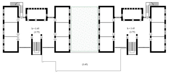 From the performed surveys, it has been recorded that the building has an irregular in-elevation configuration, consisting of a portion (entrance zone) on one floor above ground and the remaining part with two floors above ground.