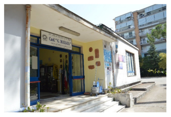 The building, used as secondary school, was designed by Engineer Francesco Santoli in 1965, under the auspices of the Law No. 645 of 9 August 1954. The building occupies a total area of 1650 square meters and consists of two distinct structures (Figure 4):