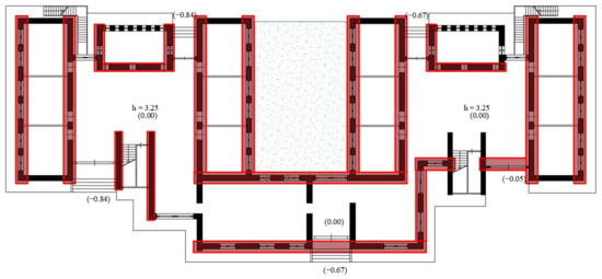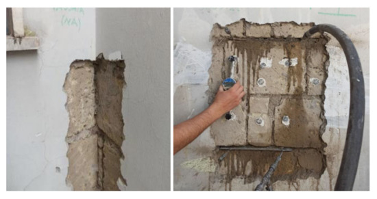The tests conducted for mechanical characterization of masonry have foreseen thermographic investigations on floors for definition of their composition, excavations on foundations to define their typology, removal of plaster on load-bearing walls to determine the connection degree with floors and other walls and double flat jack tests. Illustrations of the different tests on structural components herein taken into consideration are found in Figure 9, Figure 10, Figure 11, Figure 12 and Figure 13.