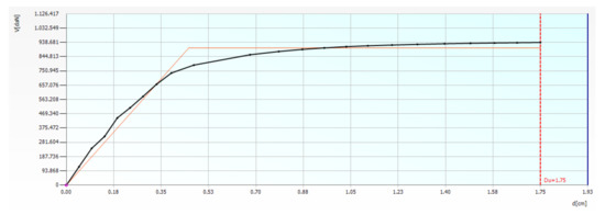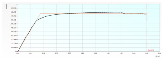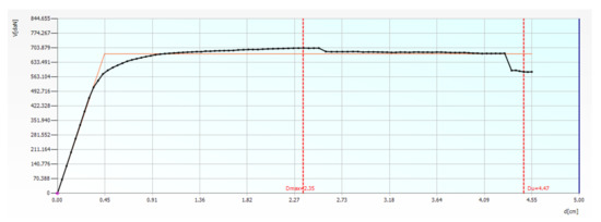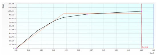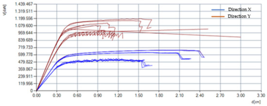 The same most unfavourable pushover curves detected in the case of application of an FRP system are also reported when FRCM intervention is applied, as shown in Figure 32 and Figure 33. From pushover analyses, it was found that the minimum seismic risk safety factors assume values of 0.97 and 0.84 in directions x and y, respectively. The results obtained demonstrate that, compared to the FRP system, the FRCM one provides the same safety factor in direction x and a slightly smaller factor (0.84 instead of 0.92) in direction y. However, also in this case, the system reliability is proved, since it provides the building seismic upgrading increasing the seismic safety factors of at least 0.1 in both directions. After calculation of both PAM and IS-V parameters, a class B (instead of class A with FRP system) dictated by PAM is achieved for the seismically upgraded building.