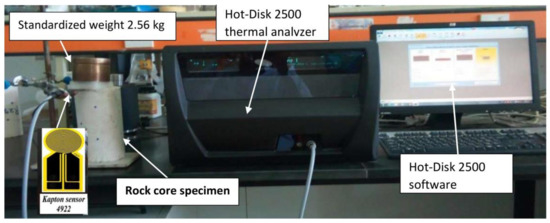 The TPS method was used in this investigation to determine the thermal characteristics of the limestone rock specimens. The hot disk transient technique is a non-destructive, high-accuracy method with easy-to-prepare specimens [13,25]. The main advantages of the hot disk technique include a wide range of measurable thermal conductivity, from 0.005 (W/(m × k)) to 500 (W/(m × k)), over a wide temperature range from −50 °C to 750 °C. The experiment setup is schematically shown in Figure 4.