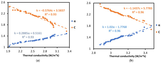 Thermal conductivity versus thermal diffusivity and specific heat for limestone rocks in (a) source 1 and (b) source 2 ((k) in a unit of (W/(m × K)), (α) in a unit of (mm2/s), and (C) in a unit of (MJ)/(m3 × K)).