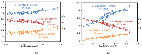 Thermal properties vs. dry density in (a) source 1 and (b) source 2((k) in a unit of (W/(m × K)), (α) in a unit of (mm2/s), and (c) in a unit of (MJ)/(m3 × K)).