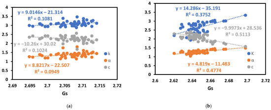 Thermal properties vs. Specific gravity in (a) source 1 and (b) source 2 ((k) in a unit of (W/(m × K)), (α) in a unit of (mm2/s), and (c) in a unit of (MJ)/(m3 × K)).
