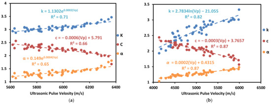 Thermal properties vs. pulse velocity in (a) source 1 and (b) source 2 ((k) in a unit of (W/(m × K)), (α) in a unit of (mm2/s), and (c) in a unit of (MJ)/(m3 × K)).