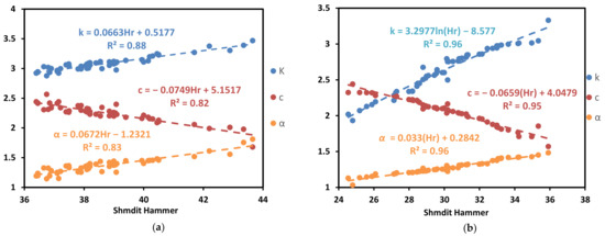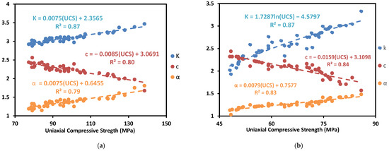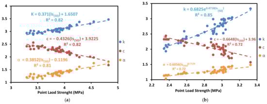 Thermal properties vs. point load strength in (a) source 1 and (b) source 2 ((k) in a unit of (W/(m × K)), (α) in a unit of (mm2/s), and (c) in a unit of (MJ)/(m3 × K)).