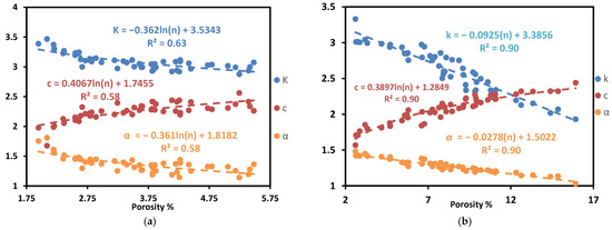 Thermal properties vs. Porosity in (a) source 1 and (b) source 2 ((k) in a unit of (W/(m × K)), (α) in a unit of (mm2/s), and (c) in a unit of ((MJ)/(m3 × K)).