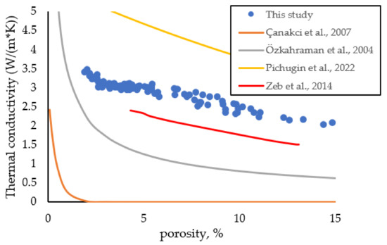 Additionally, the relationship between thermal conductivity and porosity has been compared between the results of this study and with what some researchers have found, including Özkahraman et al. [17] on limestone and travertine and Çanakci et al. [9] on clayey and chalky limestone, Pichugin et al. [39] on different types of sedimentary rocks, and Zeb et al. [40] on porous limestone as shown in Figure 11. In general, it is clear from Figure 11 that there is an inverse relationship between the thermal conductivity and the porosity, but perhaps the reason for the incompatibility between the types of curves is that the relationships are more general and applied to more than one type of rock.