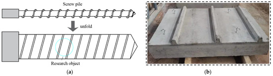 The least-explored part of the research on the bearing mechanisms of the screw piles is the contact relationship between the screw teeth and soil, including soil deformation and stress variation. As the pile is a large structure along its length direction, conventional model tests often choose a small geometric scale, most of which are about 1:10. However, using this scale, the height of the screw teeth in this paper is only 6 mm and the screw pitch is 54 mm. The soil deformation and stress monitoring is difficult, which hinders the analyzing their contact relationship. In addition, the pile–soil contact interface of screw piles has complex three-dimensional spiral geometry, so directly studying the interaction law between the screw teeth and soil on a three-dimensional level is difficult [27]. Based on the abovementioned considerations, a partial area was chosen as the test object after unfolding the screw pile (Figure 2).