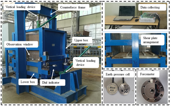 A self-designed large-scale direct shear apparatus was used in the direct shear test, as shown in Figure 3. During the loading process, the upper box is fixed, and the jack pushes the lower box to realize the shearing between the screw shear plates and soil. The size of the shear plane is 800 mm × 500 mm, and the heights of the upper and lower boxes are 600 mm and 300 mm, respectively. Three indexes were monitored in the direct shear test, including soil deformation, soil stress, and the relative displacement of the upper and lower boxes.
