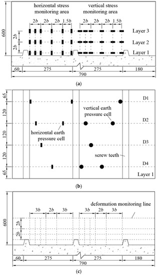 Monitoring arrangement of the 8b screw shear plate. (a) Front view, (b) top view of the earth pressure cell of Layer 1, and (c) monitoring network of soil deformation.