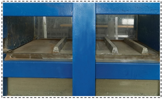 Concrete screw shear plates with dimensions of 790 mm × 490 mm × 120 mm were placed in the lower box. The height of the screw shear plate was adjusted to be flush with the edge of the lower box by padding a certain thickness of sand and stone mixture. Taking the 8b screw shear plate as an example, the model assembly is shown in Figure 5.