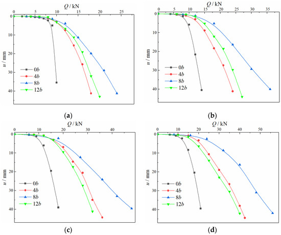 By analyzing each Q–u curve, it can be found that with an increase in the screw pitch, the bearing capacity of the screw shear plate first increased and then decreased. The bearing capacity of the plane shear plate is the minimum, while the bearing capacities of the 4b and 12b screw shear plates are increased and are similar. When the screw pitch was 8b, the bearing capacity of the screw shear plate reached its maximum. Compared with other screw shear plates, the Q–u curves of the 8b screw shear plate showed a gradual change trend, indicating that the interaction form is more conducive to load transfer under this condition. The above variation may be due to the bearing effect of the soil around the screw teeth reaching the maximum when the screw pitch reaches a certain value. In this case, the screw pitch is the optimal screw pitch.