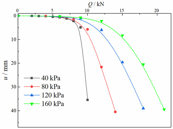 Since each Q–u curve is under the gradual change trend, the horizontal load when the settlement reaches 40 mm was uniformly selected as the ultimate load according to the Technical Code for Testing of Building Foundation Piles [28]. If there was an obvious inflection point, the corresponding load was chosen as the ultimate bearing capacity.
