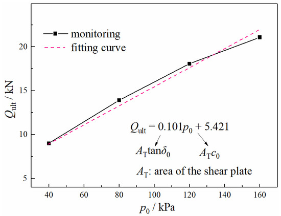 The values of δ0 and c0 can be obtained from the relationship curve of Qult–p0 of the plane shear plate (Figure 8). The fitting results show that δ0 = 0.50φ and c0 = 0.57c.
