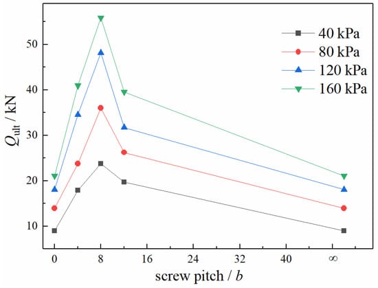 In order to analyze the determination method of the optimal screw pitch, the Qult–b curves were drawn and analyzed. The variation curves of the ultimate bearing capacity of the screw shear plates with different screw pitches are shown in Figure 9.