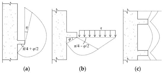 Theoretical assumptions of the failure mode under the screw teeth. (a) Meyerhof, (b) Terzaghi, and (c) arch.