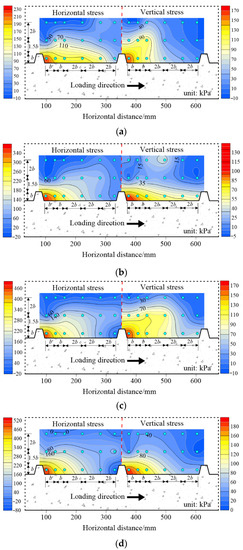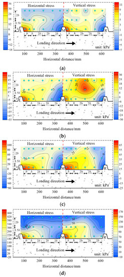 Variation of soil stress under different pressures. (a) Q = 6 kN, u = 0.21 mm, (b) Q = 18 kN, u = 2.14 mm, (c) Q = 27 kN, u = 12.26 mm, and (d) Q = 48 kN, u = 39.53 mm.