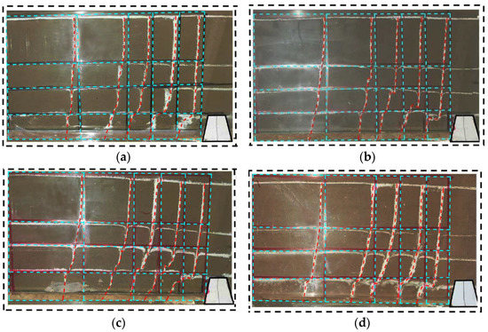 Figure 4a shows the front view of the earth pressure cell layout, with three layers in total. Taking Layer 1 as an example, the top view is shown in Figure 4b. Moreover, a deformation monitoring network was formed by burying multiple crossing white lines in the soil near the shear plane, and a line network identical to the monitoring network was drawn on the transparent glass as the reference for the initial position (Figure 4c).