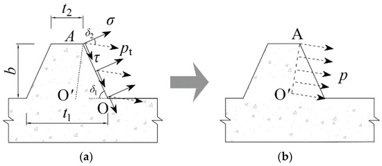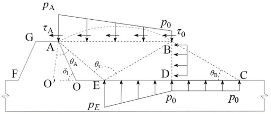 In order to illustrate the relationship between the applied force and failure surface, the force pt on OA was projected on the virtual surface O’A, which is perpendicular to pt. The corresponding pressure is p, as shown in Figure 16b. According to the geometrical relationship, the conversion relationship between pt and p can be obtained as follows: