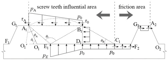 According to the law of soil stress variation and deformation obtained from the test, the final failure pattern of the soil around the screw teeth is assumed, as shown in Figure 17. The main influence area of the screw teeth is divided into three parts. The OAE is the core passive earth pressure failure zone, BCD is the subsequent passive earth pressure failure extension zone, and the ABDE is the transition zone between both passive failure zones. Correspondingly, AE is the passive failure surface generated by the pressure of the OA surface, and BC is the passive failure surface generated by the pressure of the BD surface. According to the stress characteristics of the screw teeth and soil, the following simplifications and assumptions were made: