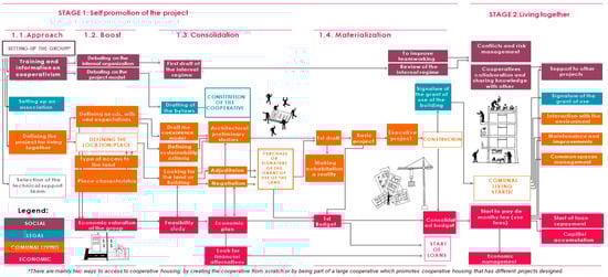 Cooperative housing under the GoU model has two stages: (1) self-promotion of the project (lasting from 4 to 7 years); and (2) living together (currently the grant-of-use is between 30 and 100 years or more). The self-promotion stage triggers a long and exhausting process with different steps that overlap. Figure 1 summarizes these two stages with the different processes and steps involved.
