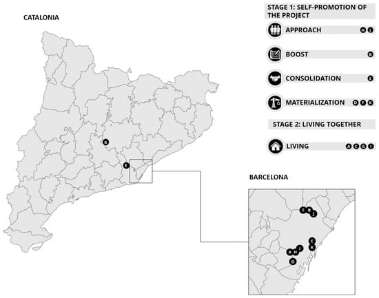 Nine out of the 11 cooperatives were in Barcelona (urban area), and 2 in a rural area in Catalonia. The cooperatives were at different stages of development: 2 cooperatives were in the phase of self-promotion: approach (3 interviewees), 1 cooperative was in self-promotion: boost (3 interviewees), 1 cooperative was in self-promotion: consolidation (1 interview), 3 cooperatives were already in the stage of materialization (6 interviewees) and finally in 4 cooperatives participants were already living together (13 interviewees). The length of time the interviewees had been living in the cooperatives ranged from 4 months to 13 years. Figure 2 shows the location of the GoU housing cooperative projects in Barcelona and Catalonia.