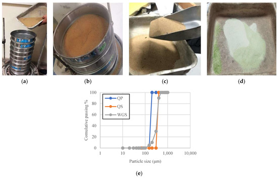 Oven-dried aggregates were sieved with the help of the mechanical shaker through a stack of sieves to consider a specific particle size for each aggregate type. A particle size of 300 µm was chosen for both QS and WGS (particles retained in sieve #50), while a particle size of 150 µm was chosen for QP (particles retained in sieve #100), as shown in Figure 2.