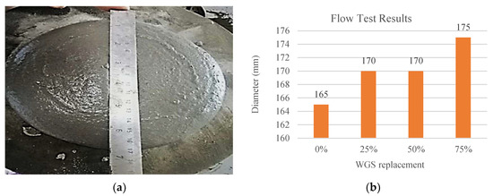 - Regarding concrete workability, slump flow results showed a slight increase in the distribution diameter as the replacement percentage of WGS increased, which indicates better workability. Specimen WGS75 showed the best workability among the concrete mixes, which is similar to the findings of other studies that adopted the same replacement level. However, in other studies, it was shown that the shape of glass particles (the presence of sharp edges) could have an adverse effect on workability.