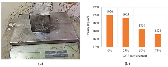 Compared to previous work done on similar topics, the density showed to decrease as the percentage of WGS increased [1,22]. However, in some studies, when the WGS used had a higher density than the quartz sand, the density of concrete showed an increase as the replacement percentage increased [35].
