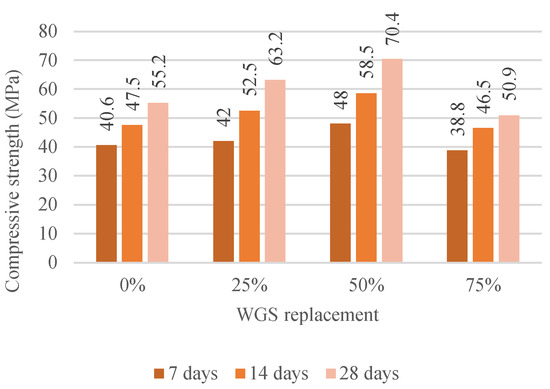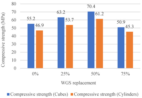 The best replacement percentage for the highest compressive, according to previous studies, ranges from 20% to 75%, depending on the type and shape of WGS used in the replacement procedure [1,22]. However, in some studies, the presence of WGS led to decreasing the compressive strength of concrete [35]. This was justified by the high porosity of WGS concrete, which led to a negative effect on the compressive strength.