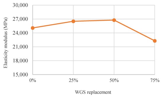 Substituting aggregates with Waste glass sand, according to some research studies, tends to have a positive influence on the elasticity modulus when used at small percentages. This can lead to a similar or slightly higher modulus of elasticity compared to control specimens. The results in Figure 11 show that as the percentage of WGS in concrete increased, the elasticity modulus slightly increased up to a 50% replacement level, whilst a 75% replacement level resulted in a reduction in the modulus of elasticity by around 12% compared to the control specimen. In summary, the elasticity modulus tends to show a dramatic decrease with an increasing percentage beyond 50%.