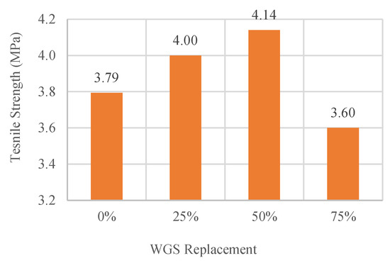 Previous research showed a similar trend regarding the split tensile strength [1,22], but they didn’t agree on the best replacement percentage of WGS that resulted in the highest tensile strength, and some of them concluded that replacing WGS with different types of sands, e.g., quartz sand and river sand, led to different increasing percentages in the tensile strength [22].