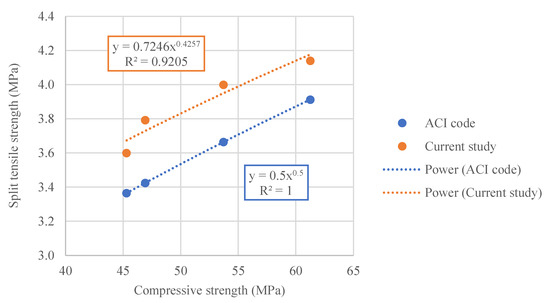 The ACI code [36] derived a relation between the split tensile strength and cylindrical compressive strength for normal concrete. The equation was plotted in Figure 13 and used as a reference to be compared with the fitting curve from this study that relates the same parameters. The fitting curve has the formula: