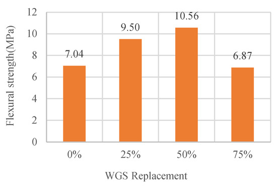 The flexural strength results presented in Figure 14 showed that specimens with 50% glass sand replacement showed the highest flexural strength of 10.56 MPa. This is 50% higher than the flexure strength of the control specimen. As the replacement percentage went beyond 50%, the flexure strength showed a significant reduction. This lies within the range of several previous studies conducted on concrete with WGS [1,22]. However, some other studies indicated a reduction in flexure strength as the percentage of WGS increased due to the high porosity of concrete incorporating WGS [35].