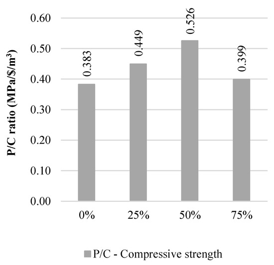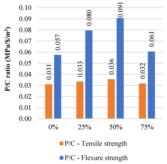 Moreover, a similar trend was realized for the split tensile strength and flexure strength, where the P/C ratio increased from 0.031 MPa/$/m3 for specimen WGS0 to reach a maximum value of 0.036 MPa/$/m3 for specimen WGS50. As for the P/C ratios for flexure strength, it increased from 0.057 MPa/$/m3 for WGS0 to reach a maximum value of 0.091 MPa/$/m3 for WGS50. Although the P/C ratio for split tensile and flexure strength decreased at replacement level 75%, it was still higher than the P/C ratio of control specimen WGS0, as depicted in Figure 17.