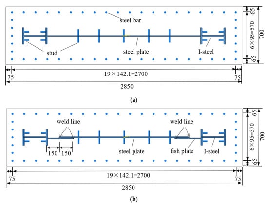 The distribution spacing of the steel bar with a diameter of 25 mm along the section length is 142 mm, and along the section width, it is 95 mm. A stud with a diameter of 9 mm is arranged on the I-steel and steel plate. The distribution spacing along the height of the I-steel is 200 mm, and along the section width, it is 100 mm; the stud spacing on the steel plate is 300 mm.